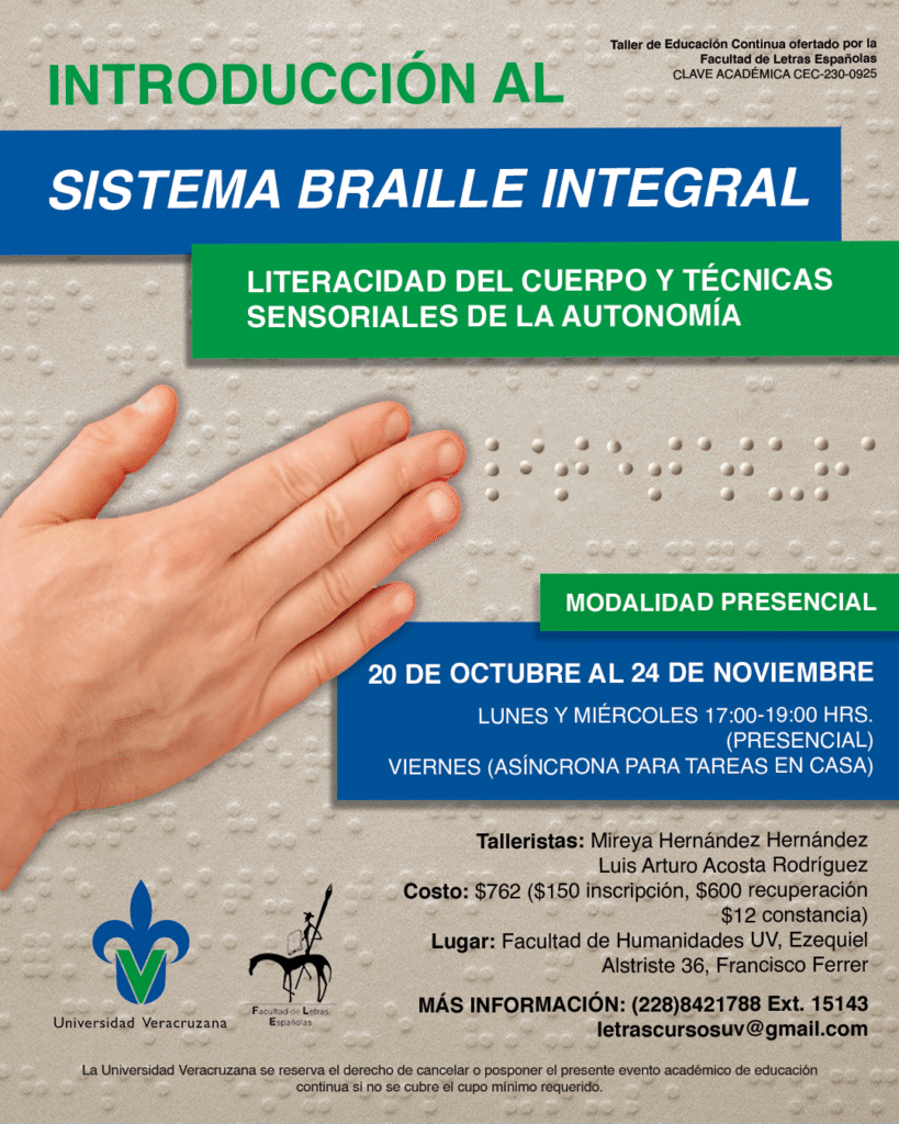 Para “no perder lo que puede y debe significar el acceso a la lectura y a la lectoescritura”, Arturo y Mireya están próximos a impartir el “Taller Introducción al Sistema Braille Integral: Literacidad del Cuerpo y Técnicas Sensoriales de la Autonomía” de la mano de la Universidad Veracruzana. Este es, el primer taller de braille impartido en la Facultad de Humanidades. Además, a futuro quieren formalizarse como un colectivo o asociarse a una institución que los respalde. “No tenemos un nombre, no somos un colectivo, somos Mireya y Arturo” afirma él. E incluso así, solo siendo “Mireya y Arturo” han construido una comunidad de lectores con impacto social, de personas que se atreven a expandir su horizonte y a mirar al “otro” como lo que es, un ser humano.