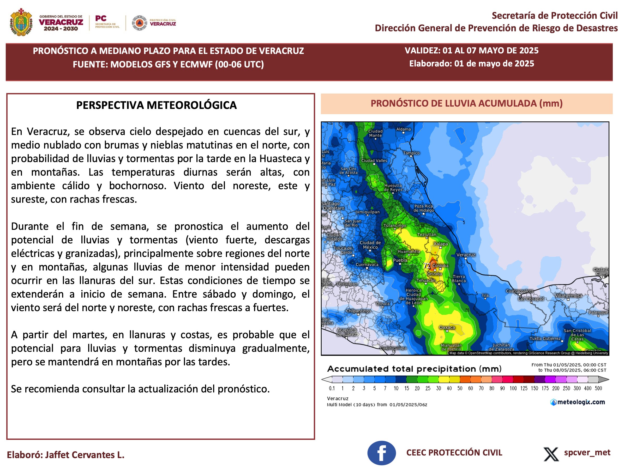Redacción. Xalapa, Ver.- En las siguiente 24 horas persistirá la probabilidad de lluvias con algunas tormentas (descargas eléctricas, viento arrachado…