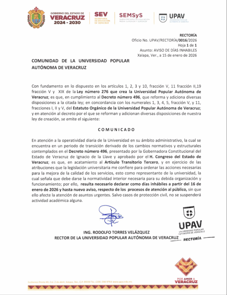 Cuatro días después, el 16 de enero, la UPAV anunció la aplicación de días inhábiles “hasta nuevo aviso” para los procesos de atención al público en su área administrativa. El comunicado, firmado por el rector Rodolfo Torres Velázquez y fechado el 15 de enero, informó que la universidad entraba en un periodo de transición derivado de los cambios normativos y estructurales establecidos en el Decreto número 496.
