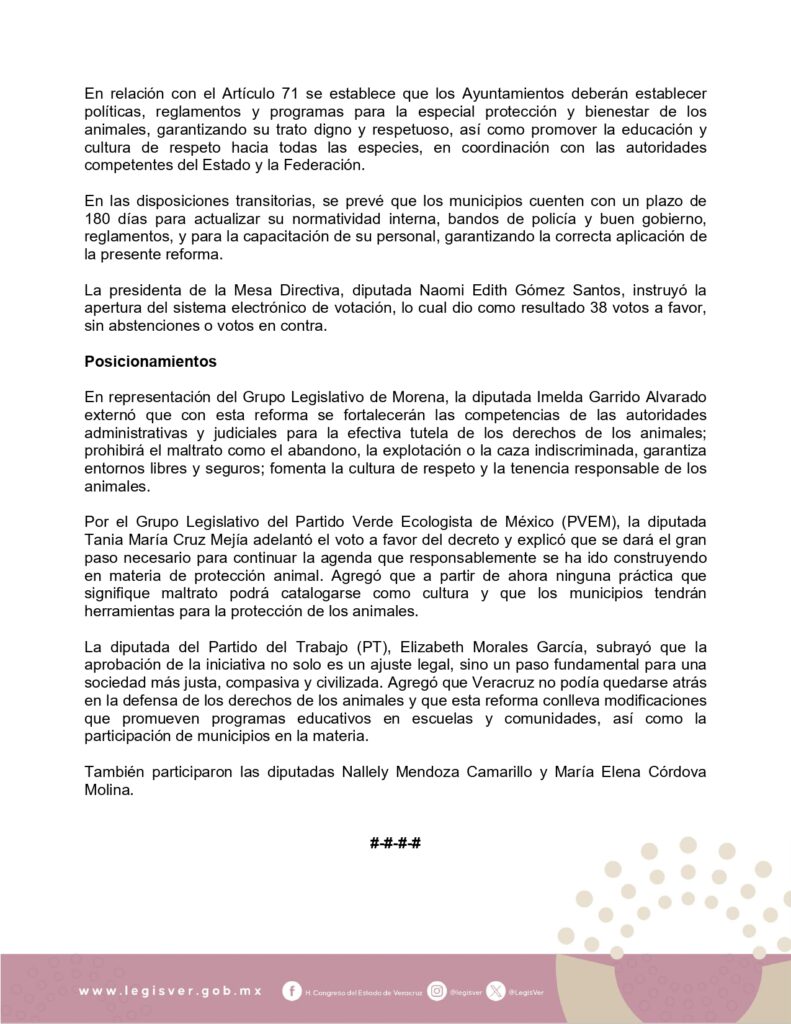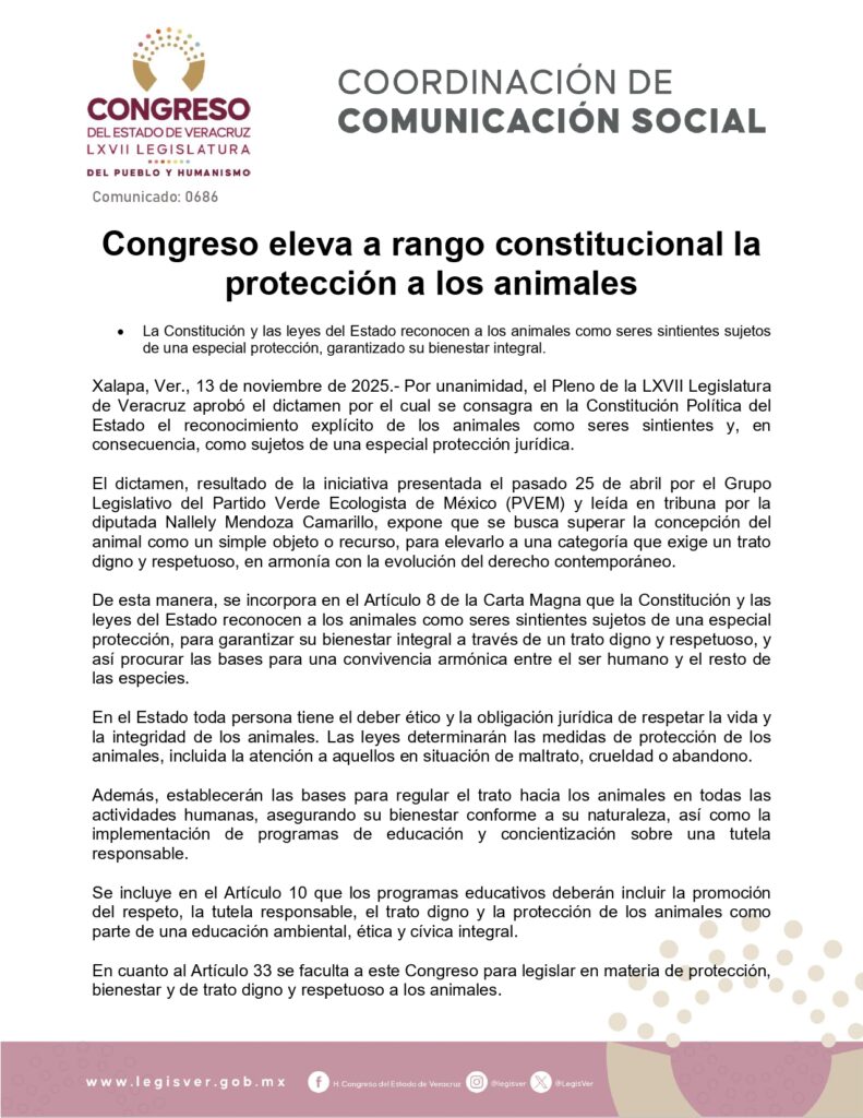 Esta reforma coloca a Veracruz como uno de los pocos estados de la República que elevan la protección animal a nivel constitucional, consolidándose como referente nacional en la materia.