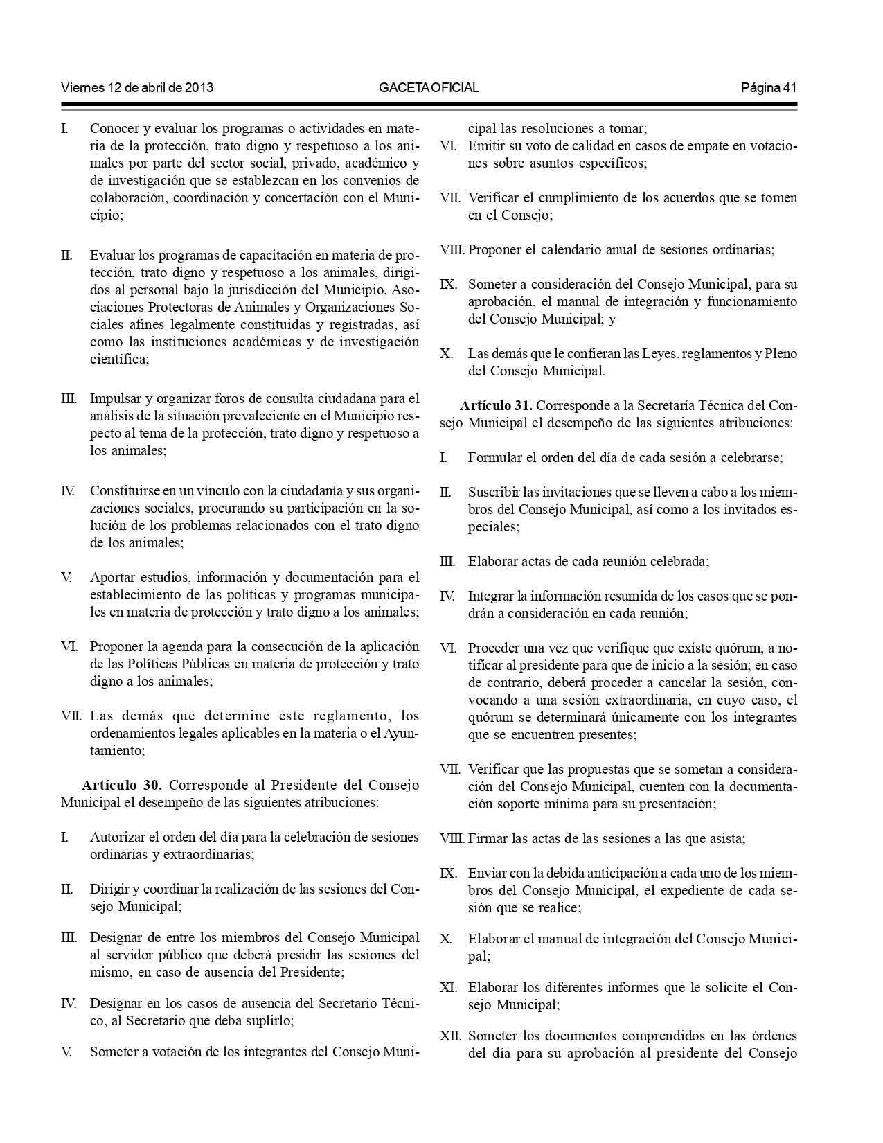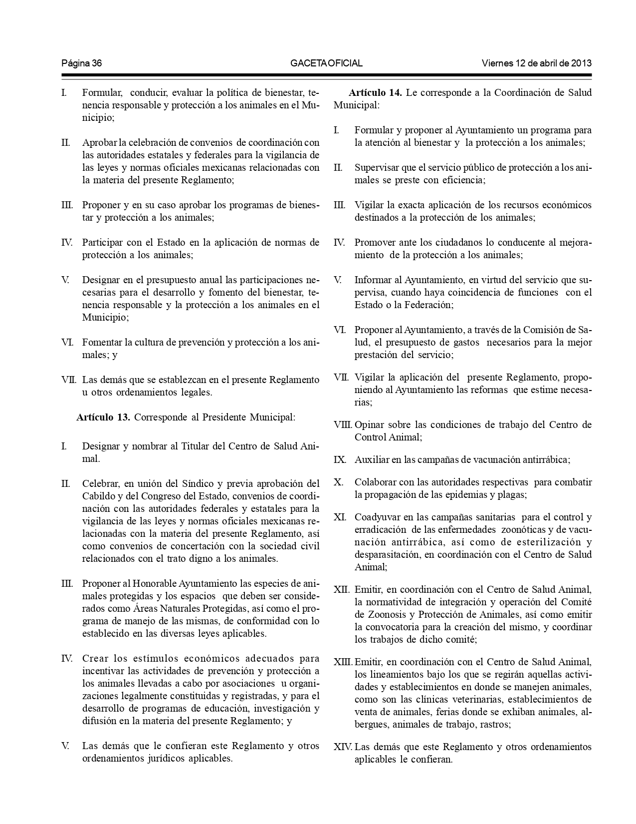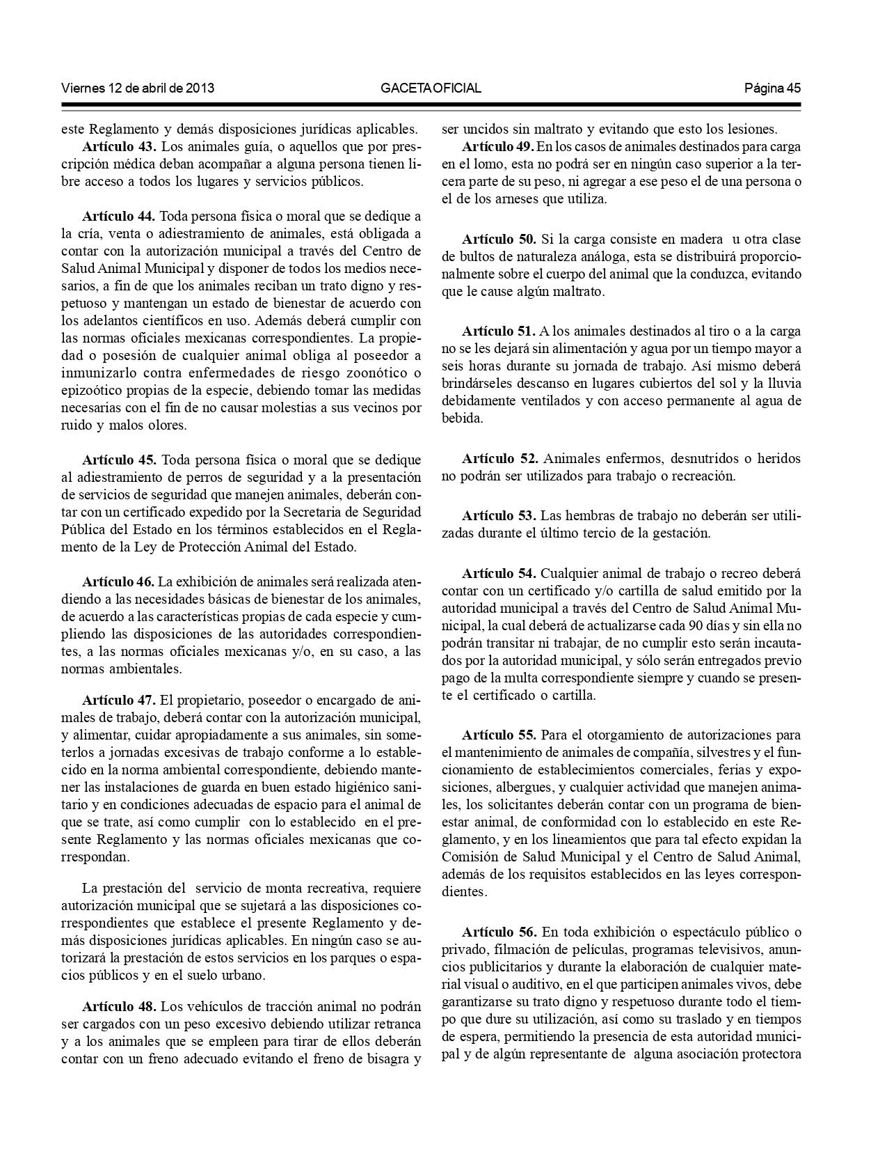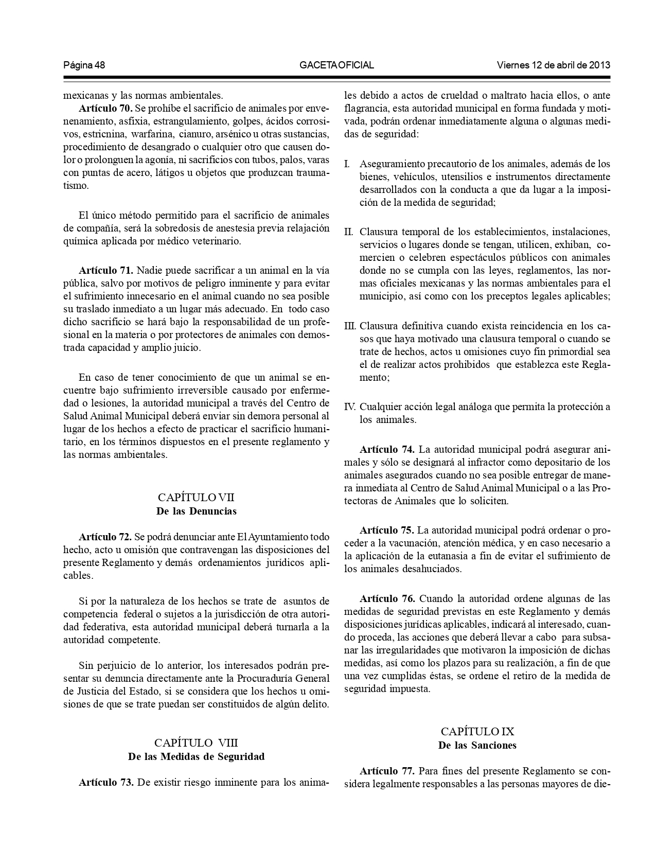 - Artículo 71: Obligación a los ayuntamientos de implementar programas, reglamentos y políticas públicas para proteger y promover el respeto hacia los animales.